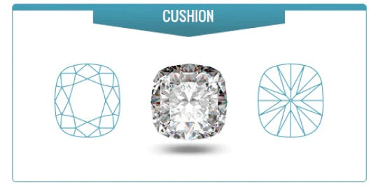 The Cushion shape is a great combination between the round diamond and the princess diamond. It generally still has a square or rectangular shape, but with beautifully rounded corners. The Cushion style is one of the classic diamond cuts, which makes it highly popular in jewelry design, and can be found in many antique diamond jewelry pieces.
