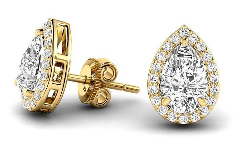 Elevate your style with the stunning brilliance of pear and round-cut halo stud earrings, encircled by shimmering accent diamonds. These breathtaking designs combine graceful sophistication and timeless sparkle, making them the perfect choice for any occasion.