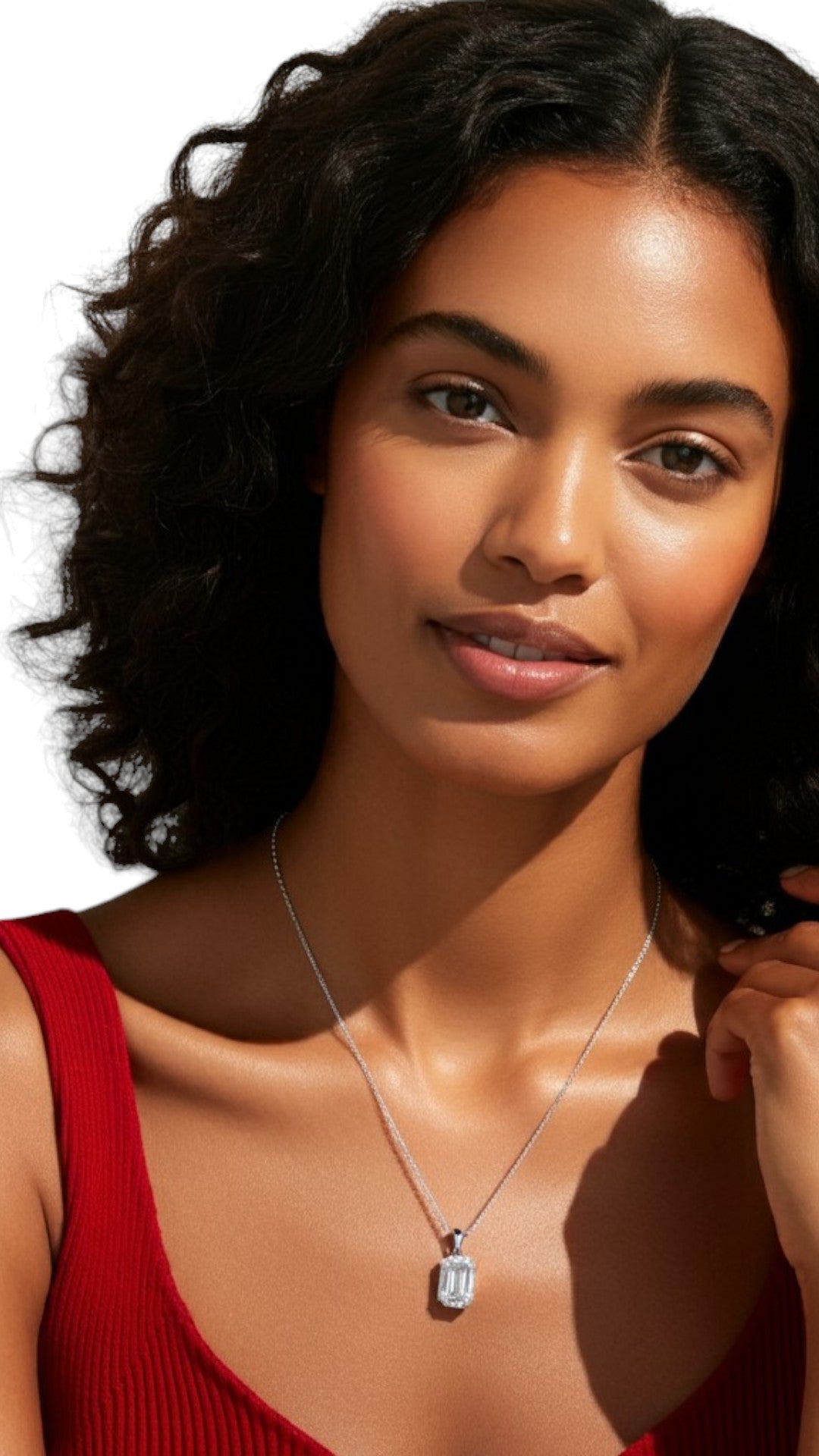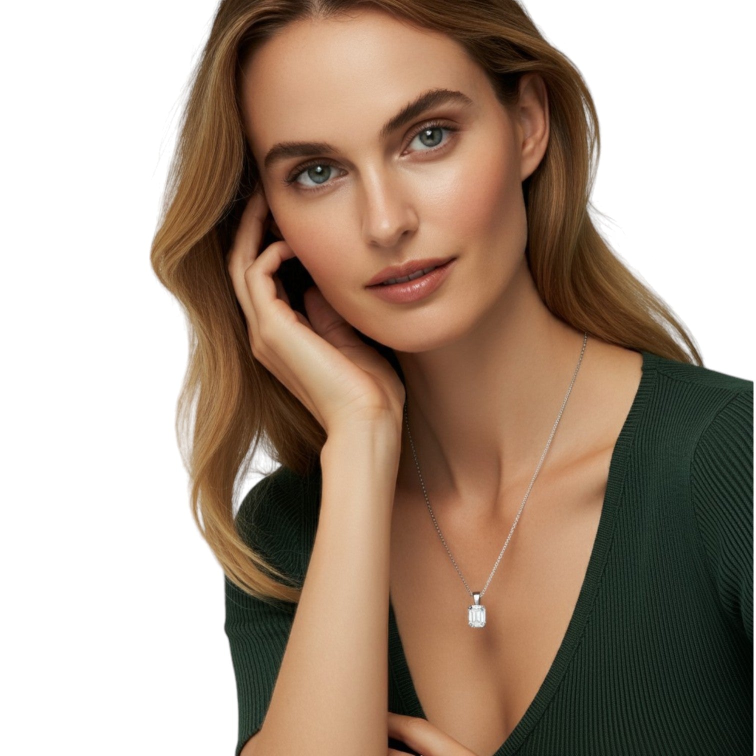 This solitaire pendant features 0.50 to 3.00 carats of emerald-cut lab-grown diamonds, set in a sleek four-prong setting. The elongated shape and clean lines of the emerald cut enhance the diamond's clarity and brilliance, creating a sophisticated and timeless look.