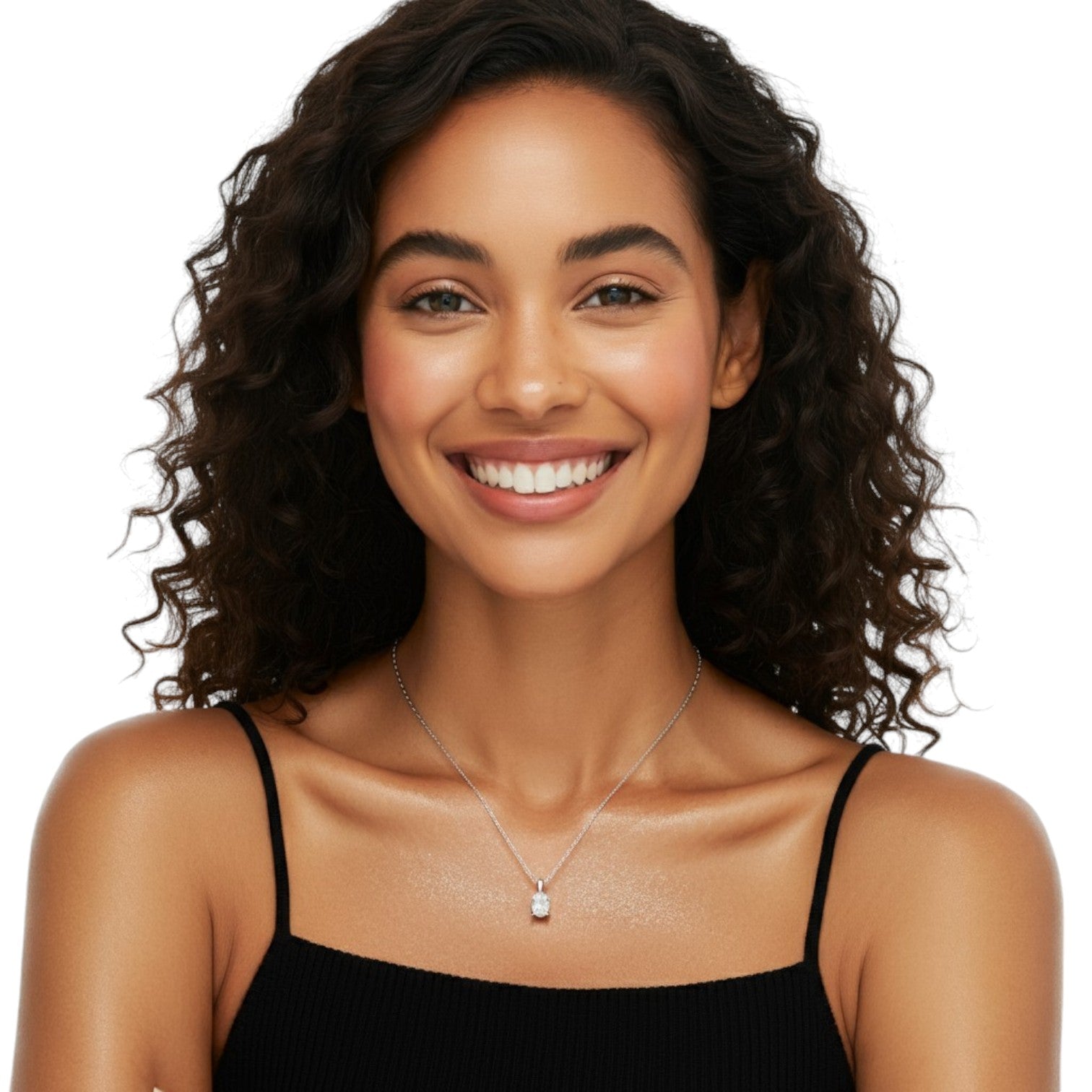 This solitaire pendant features 0.50 to 3.00 carats of oval-cut lab-grown diamonds, set in a timeless four-prong setting. The elongated shape of the oval cut enhances the diamond's brilliance and visual appeal, creating an elegant and sophisticated piece suitable for any occasion.