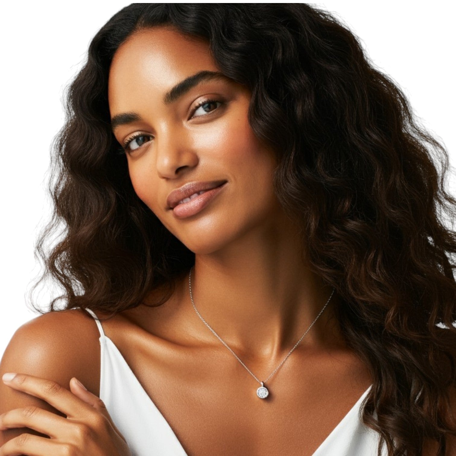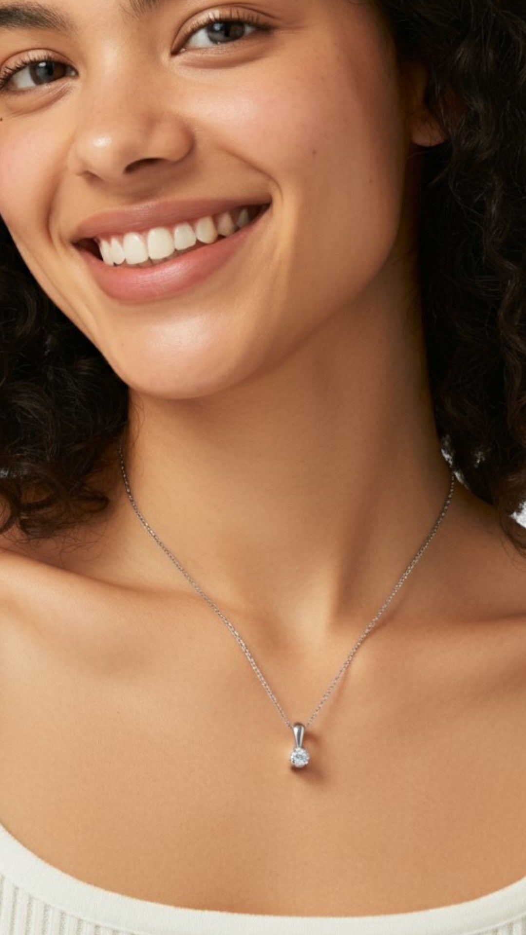 This solitaire pendant highlights 0.50 to 3.00 carats of round-cut lab-grown diamonds, elegantly set in a timeless bezel setting. Its minimalist design enhances the diamond’s brilliance, making it a versatile and sophisticated accessory for any occasion.