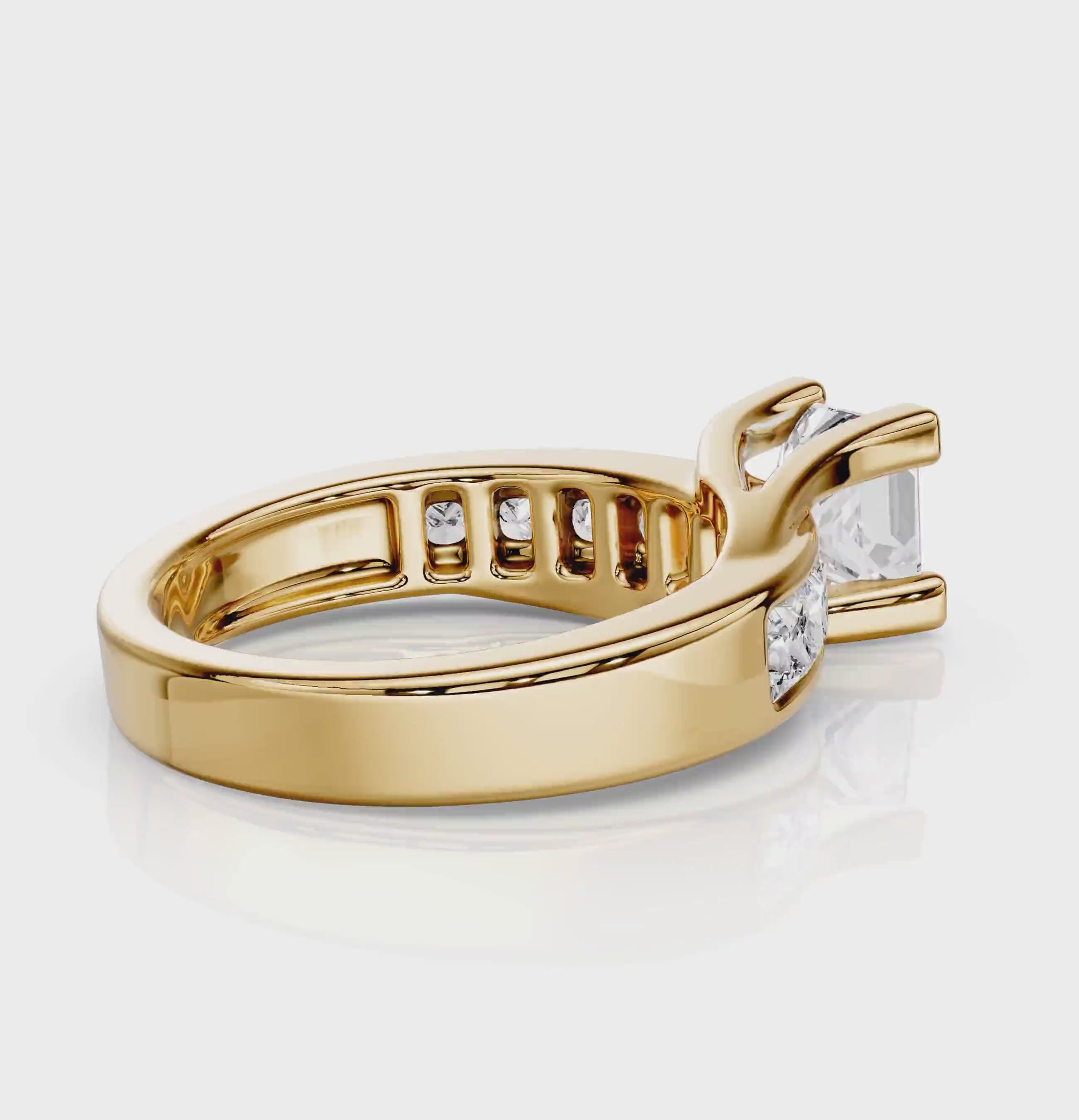 - Side Stones 1: 12 Princess Cut lab grown diamonds weighing 0.60 carat
