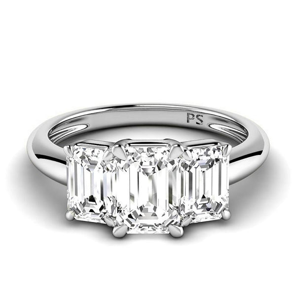 - Timeless Three Stone Design: Our Three Stone Ring showcases a trio of stunning 1.70-4.20 CT emerald-cut lab-grown diamonds, symbolizing the past, present, and future of your love story.