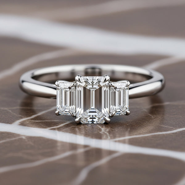 Three radiant emerald-cut diamonds sit side by side, symbolizing a love that honors the past, celebrates the present, and dreams beautifully of forever.