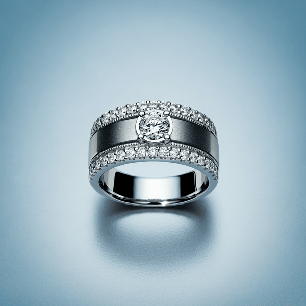 A wide platinum band with a round-cut center diamond, accented by pavé-set diamonds for bold sophistication.