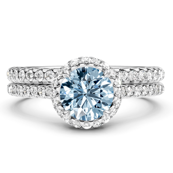 • Celebrate your love story with this 1.50-4.50 CT round cut fancy blue lab grown diamond bridal set. The vibrant fancy blue center stone is complemented by matching lab grown diamonds on both the engagement ring and the matching wedding band, creating a cohesive, eye-catching sparkle from every angle.