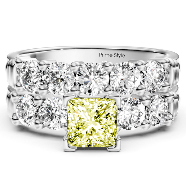 This 2.20-5.20 CT Princess & Round Fancy Yellow fancy yellow lab grown diamond bridal set pairs a radiant engagement ring with a matching wedding band. Each stone is selected for vivid color and exceptional sparkle.