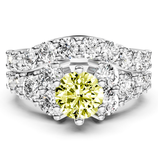 This 3.55-6.55 CT Round Fancy Yellow fancy yellow lab grown diamond bridal set pairs a radiant engagement ring with a matching wedding band. Each stone is selected for vivid color and exceptional sparkle.