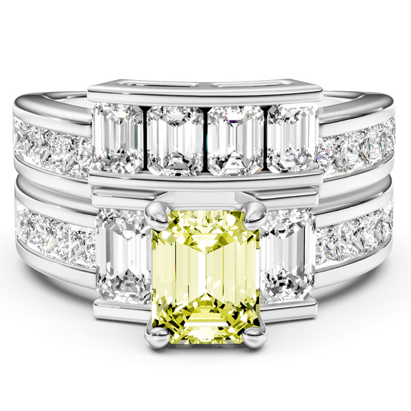 This 3.70-6.70 CT Emerald & Princess Fancy Yellow fancy yellow lab grown diamond bridal set pairs a radiant engagement ring with a matching wedding band. Each stone is selected for vivid color and exceptional sparkle.
