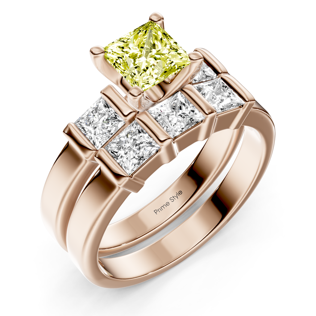 • This 2.55-5.55 CT Princess Fancy Yellow fancy yellow lab grown diamond bridal set pairs a radiant engagement ring with a matching wedding band. Each stone is selected for vivid color and exceptional sparkle.