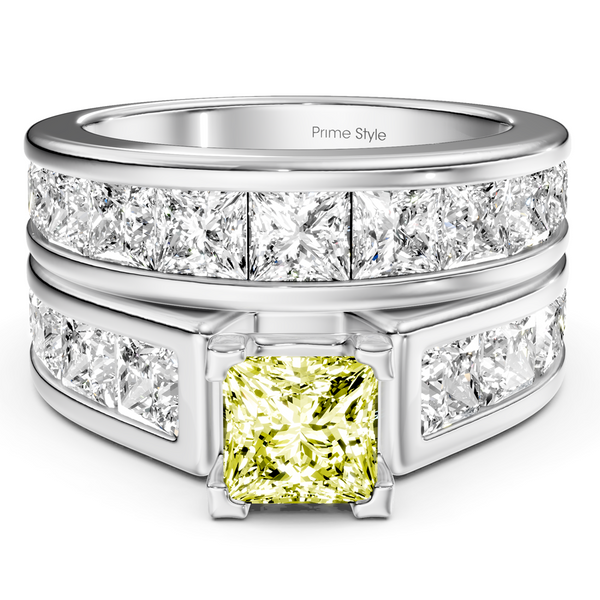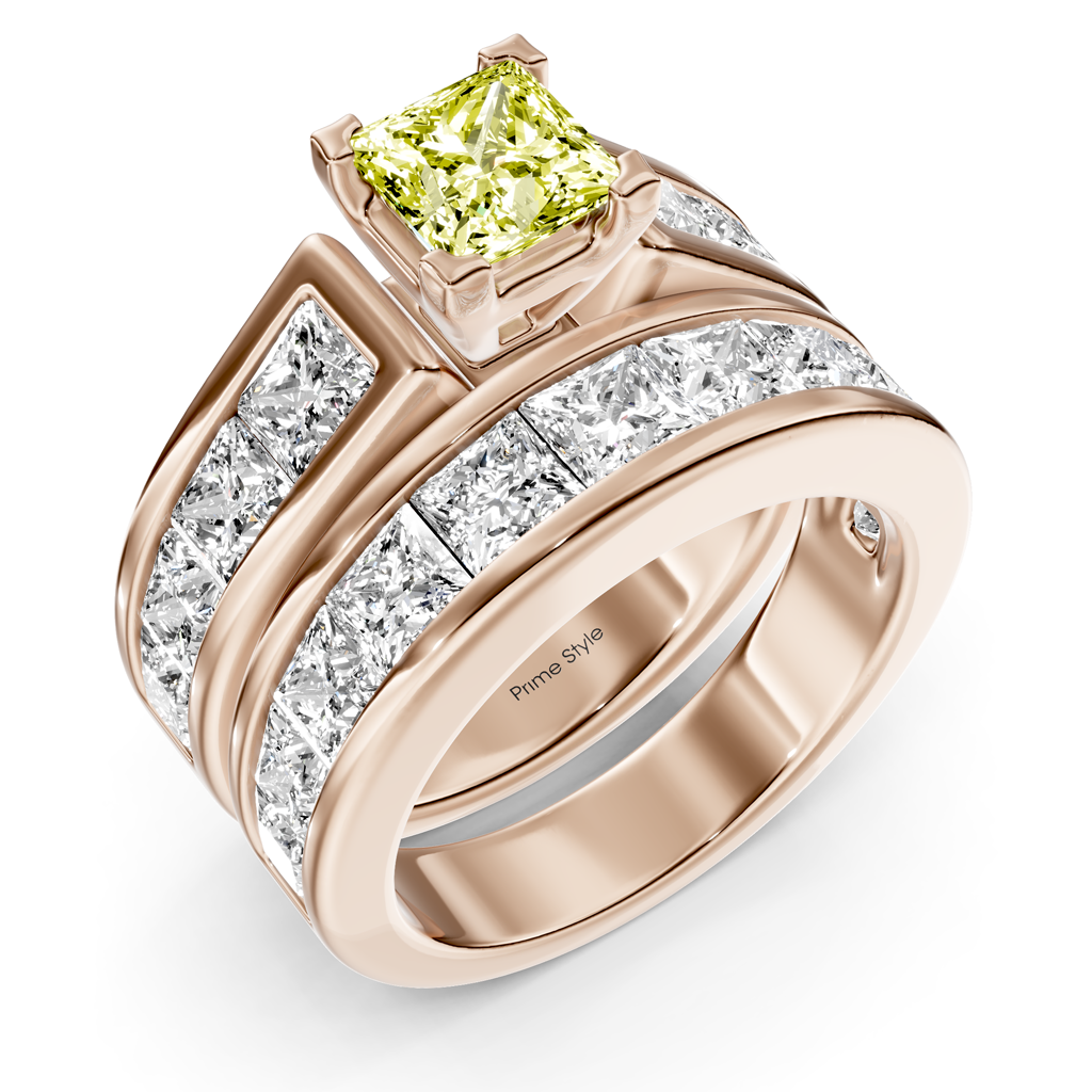 This 5.90-8.90 CT Princess Fancy Yellow fancy yellow lab grown diamond bridal set pairs a radiant engagement ring with a matching wedding band. Each stone is selected for vivid color and exceptional sparkle.