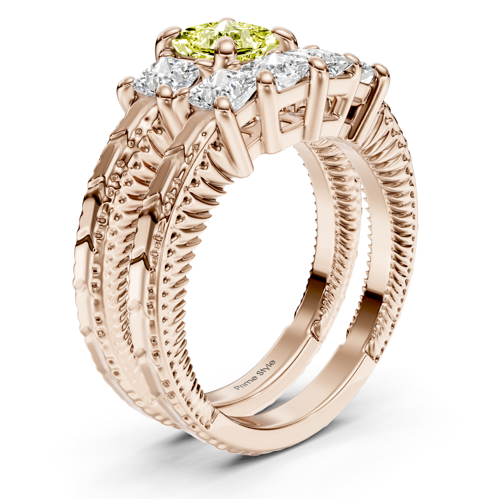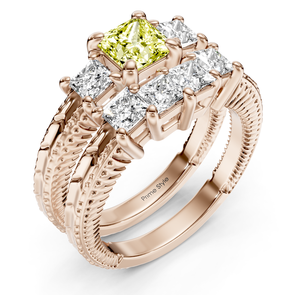 This 2.25-5.25 CT Princess Fancy Yellow fancy yellow lab grown diamond bridal set pairs a radiant engagement ring with a matching wedding band. Each stone is selected for vivid color and exceptional sparkle.
