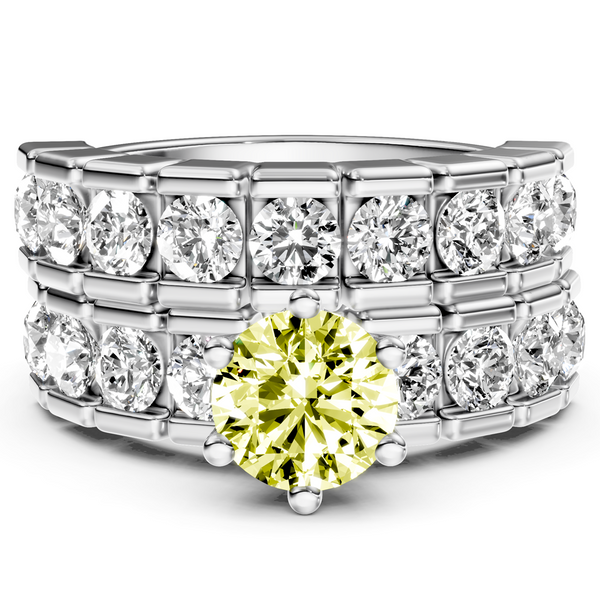 This 3.25-6.25 CT Round Fancy Yellow fancy yellow lab grown diamond bridal set pairs a radiant engagement ring with a matching wedding band. Each stone is selected for vivid color and exceptional sparkle.
