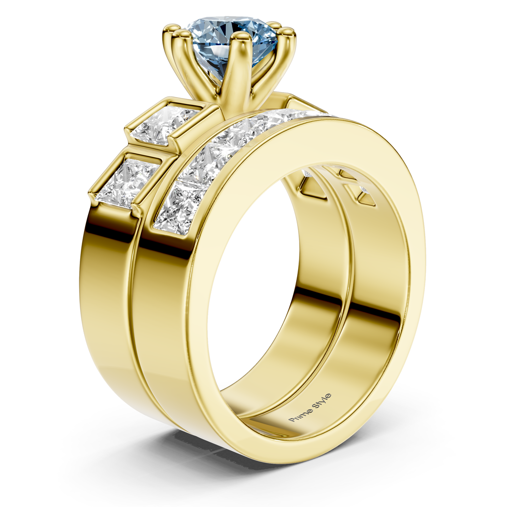 Celebrate your love story with this 3.00-6.00 CT princess and round cut fancy blue lab grown diamond bridal set. The vibrant fancy blue center stone is complemented by matching lab grown diamonds on both the engagement ring and the matching wedding band, creating a cohesive, eye-catching sparkle from every angle.