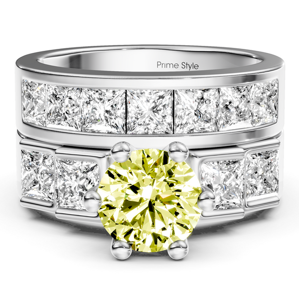 This 3.00-6.00 CT Princess & Round Fancy Yellow fancy yellow lab grown diamond bridal set pairs a radiant engagement ring with a matching wedding band. Each stone is selected for vivid color and exceptional sparkle.