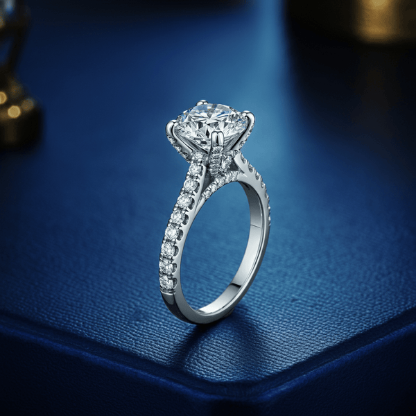 - A round-cut diamond solitaire with a platinum pavé-set band and intricate detailing for a refined, elegant look.