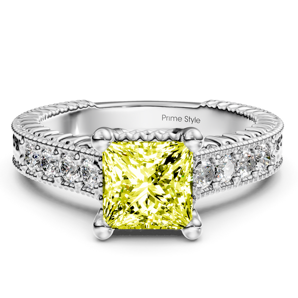 Experience the beauty of this 1.30-4.30 CT Princess & Round Fancy Yellow fancy yellow lab grown diamond engagement ring. Each stone is chosen for rich color and exceptional brilliance, offering a striking alternative to traditional white diamonds.