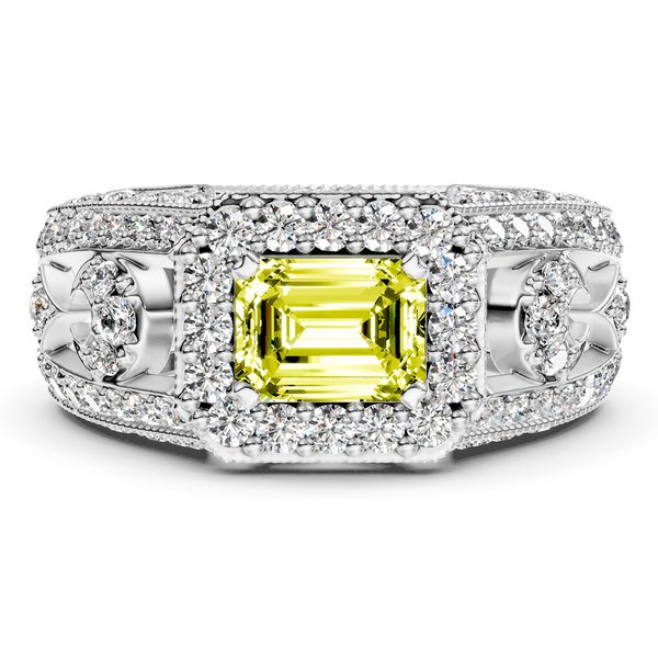 Experience the beauty of this 1.95-4.95 CT Emerald & Round Fancy Yellow fancy yellow lab grown diamond engagement ring. Each stone is chosen for rich color and exceptional brilliance, offering a striking alternative to traditional white diamonds.