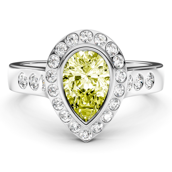 • Experience the beauty of this 1.38-4.38 CT Pear & Round Fancy Yellow fancy yellow lab grown diamond engagement ring. Each stone is chosen for rich color and exceptional brilliance, offering a striking alternative to traditional white diamonds.