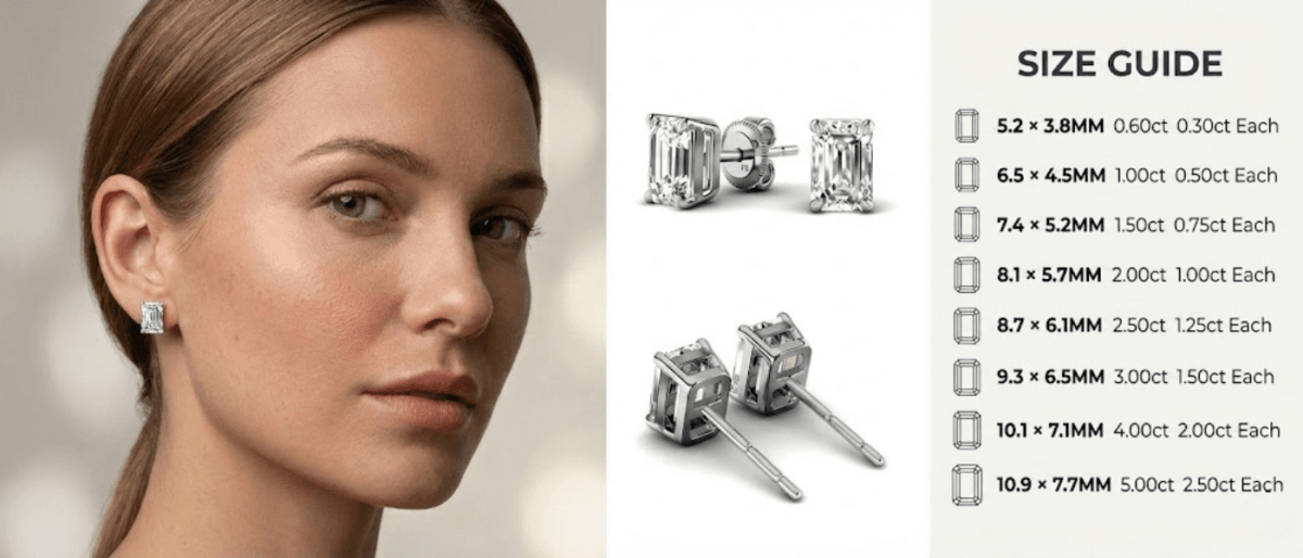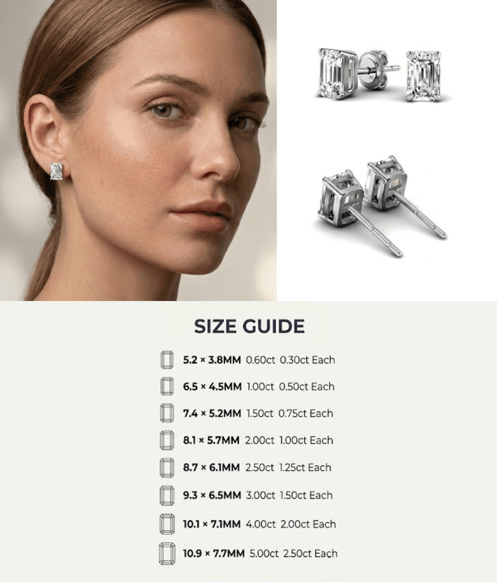 - Stunning 0.60-5.00 CT emerald cut lab grown diamonds set in a pair of elegant stud earrings.