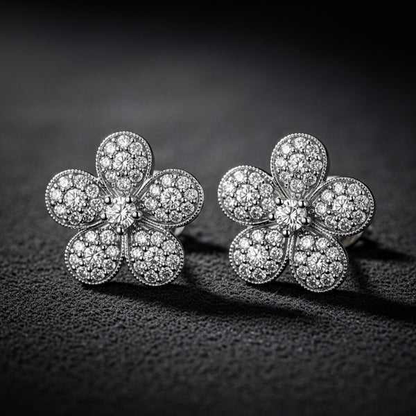 Crisp petal silhouettes filled with shimmering micro-diamonds create a clean, structured floral look that brings a modern edge to a classic motif.