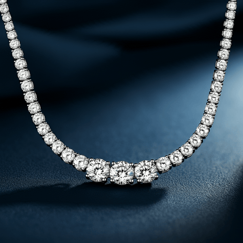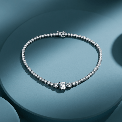 A classic tennis necklace adorned with a continuous line of round diamonds and a striking centerpiece for a modern, elegant touch.