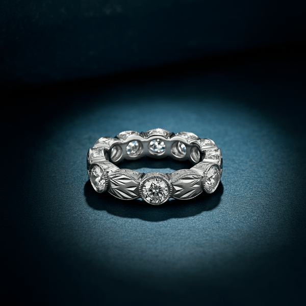 A platinum eternity band featuring round-cut diamonds with intricate engraved patterns for a vintage-inspired elegance.