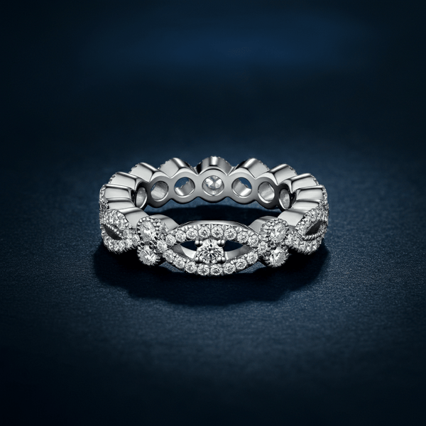 A white gold eternity band with interlocking infinity symbols, adorned with round-cut diamonds for symbolic elegance.