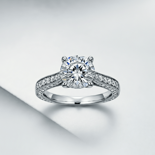 A classic round-cut diamond engagement ring set in platinum, with milgrain detailing and pave accents for vintage-inspired charm.