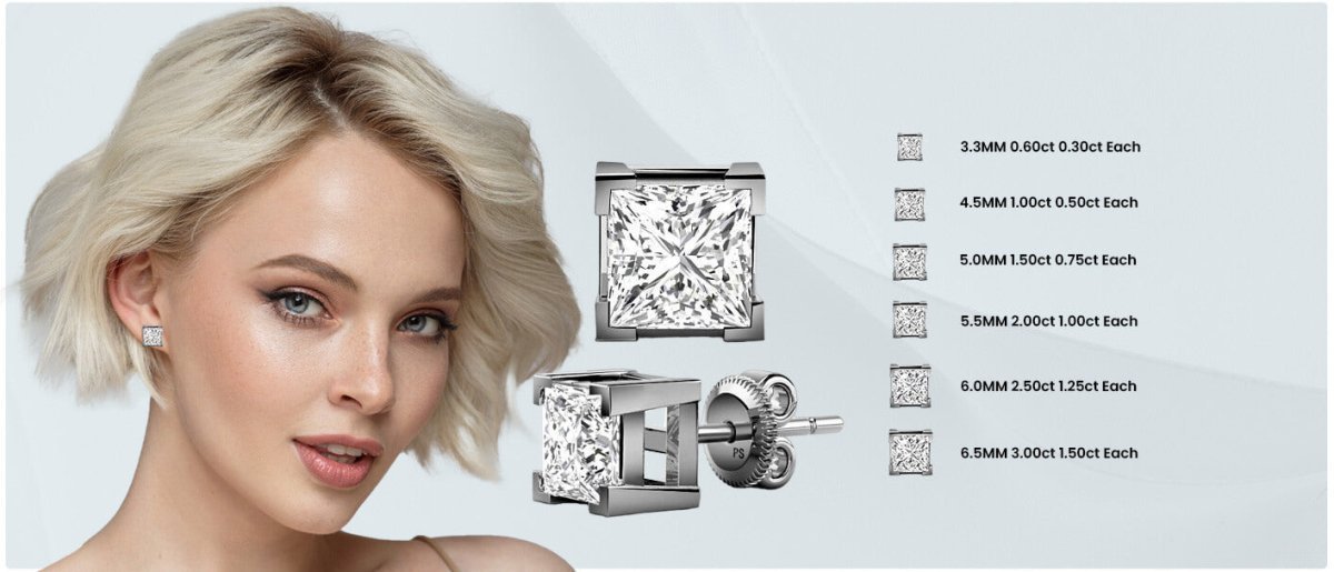 - Brilliant Princess Cut: Adorn yourself with our sparkling 0.60-5.00 CT Princess Cut Lab Grown Diamond Stud Earrings, available at PrimeStyle.
